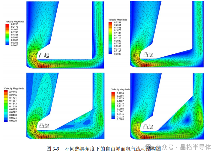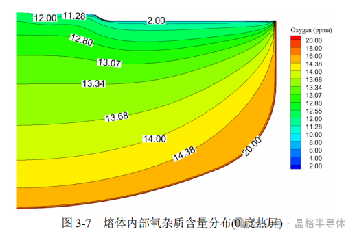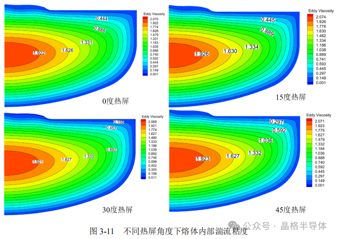 熔体内部往往存在氧,其中氧含量常用 ppma 或者 atom/cm3 进行表示,前者为百万分之一,后者为单位立方厘米的硅熔体中有多少个氧原子。在本论文中,我们使用前者用来表征熔体内部的氧含量。熔体内部的氧含量主要受到以下几种原因的影响。首先是熔体内部的温度分布与侧壁最高温度,当熔体与坩埚温度较高时,坩埚溶解氧的就越快,熔体内部溶解的氧杂质含量也就更多。同时,熔体内部的湍流黏度会影响氧杂质的扩散。我们知道在自由界面上,熔体中的一氧化硅气体会蒸发,当炉体压力较小时,蒸发速率变快,当炉体压力较大时,蒸发速度降低,固液界面就会有更多的氧原子。最后一个影响固液界面氧含量的是固液界面的偏析作用。由于晶体中氧原子的溶解度较低,熔体中的氧原子溶解度较高,因此在结晶时,刚结晶的硅晶体会在固液前沿附近的熔体中析出过量的氧原子,这种现象叫做“偏析”。当晶体的提拉速度提高时,在固液界面上偏析出的氧原子量会增加,且界面上的氧来不及在熔体内部通过对流扩散作用在自由界面蒸发,固液界面上的氧含量会增加。图3-7 为熔体内部的氧杂质含量分布。从图中不难发现,在坩埚侧壁附近,氧杂质含量最高,这是因为在石英坩埚溶解使得在坩埚侧壁释放出氧含量;在自由界面,氧以一氧化硅气体的形式蒸发,造成氧杂质含量较低,在固液界面上,氧含量介于最高值与最低值之间,同时,氧含量在固液界面上中心处沿着三相点方向,氧含量逐渐降低,这是因为三相点附近氧杂质蒸发使得氧含量相对较低。图 3-8 为不同热屏角度下,固液界面上的氧含量变化情况。不难发现,固液界面上的氧含量基本没有变化。下面我们将从氧的来源,氧的散失与氧的扩散速率三个方面对氧含量进行分析与解释。首先是氧的来源。由于热屏角度发生变化时,熔体内部的温度变化很小,熔体侧壁最高温度相差仅 0.36 K,如图 3-6 所示,而侧壁温度较高时,坩埚溶解速度就会增加,熔体与晶体界面上的氧含量也会随之增加,由于不同热屏角度,坩埚侧壁的温度变化不大,因此在氧产生的途径上,不同热屏角度下产生的氧含量基本一致。其次是氧的散失。熔体中的氧主要通过自由界面以一氧化硅气体的形式蒸发析出,而自由界面氩气的压力会显著影响一氧化硅气体的蒸发速率,而熔体与氩气界面的压力与该界面上方氩气的流动结构有关,因此有必要对自由界面的氩气流动结构进行分析。图 3-9 为自由界面出氩气的流动分布示意图。不难发现,自由界面的氩气,均是水平吹拂过自由界面上方。出现这种情况的原因是因为热屏靠近三相点处的凸起,当氩气气流从晶体侧壁吹拂至三相点附近时,由于“凸起”的存在,使得氩气汇聚在凸起下方,产生一个高速转弯区域,当氩气气流流过高速区域后,水平吹拂过自由界面。尽管当热屏角度增加后,热屏底部与自由界面的距离增加,也就是氩气在自由界面上方的流道宽度增加,但是由于氩气流刚转过弯,且流速很大,所以这时候,氩气的惯性力占主导,且氩气在自由界面处缺少一种力使得氩气向上流动,尽管热屏角度使得自由界面上方的氩气流道宽度发生了变化,但氩气不会因为流道的变宽而改变流动结构,因此,氩气均是水平吹拂过自由界面。扬州晶格半导体-提供超大尺寸柱状多晶硅、单晶硅材料,并可定制加工各类硅部件、硅锭、硅棒、硅环、硅管、硅籽晶、硅托盘、硅异形件。17826693981图 3-10 为不同热屏角度下,自由界面的氩气压力分布示意图。从图中不难发现,尽管热屏角度发生了变化,但是自由界面的压力变化非常小,基本保持不变,这是因为自由界面上氩气气流结构变化很小,所以压力基本保持一致。而一氧化硅气体的蒸发与自由界面的压力有关,当自由界面的压力变化很小时,在自由界面上蒸发的氧含量变化也很小,因此在自由界面上,氧的蒸发量基本不变。最后是熔体中氧的扩散速率。熔体内部的湍流粘度,其直接影响氧杂质在熔体中的有效扩散系数,因而影响固液界面的氧含量,图 3-11 为不同热屏角度下,熔体内部的湍流粘度。结果表明热屏角度基本不影响熔体内部的湍流粘度。这是因为熔体内部的湍流粘度与熔体内部的温度变化以及流场结构有关。前面我们讨论过,熔体内部最大温度变化很小,而不同热屏角度下,坩埚与晶体的旋转速度保持不变,因此熔体内部的熔体结构没有发生变化,这也说明了为什么熔体内部的湍流粘度变化很小。当提拉速度不变时,固液界面偏析的氧含量变化也很小;由于熔体温度变化很小,导致坩埚熔体界面产生的氧杂质含量变化很小,而由于热屏角度对自由界面的压力影响很小,导致自由界面偏析出的氧杂质含量变化不大;最后是熔体内部的湍流粘度变化不大,使得氧在熔体中的扩散速率变化很小,因此在这几种原因的共同作用下,使得熔体固液界面出的氧含量基本没有变化。