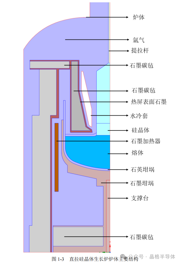 直拉单晶硅晶体生长炉具有非常多的构件,这些构件必须协同工作,以精确控制晶体提拉过程的热环境,确保高品质晶体的顺利生长。图 1-3 为晶体生长炉体的基本结构,其主要构件包括以下几部分[32]:石墨加热器、石墨坩埚、石英坩埚、熔体、晶体、热屏(导流筒)、水冷系统、侧壁保温毡、提拉杆、坩埚支撑平台等。下面将简单对各个构件的作用以及特点进行简单介绍。石墨加热器是直拉单晶硅晶体生长炉内热量的主要来源,通常通过通电加热的方式产生焦耳热,主要通过辐射方式加热整个炉体系统以熔化多晶硅原料并保持熔化所需的温度。因此石墨加热器要具有很高的耐高温性能和热导率,低的电阻率,只有这样,石墨加热器才可以在高温下长时间稳定、高效的工作。扬州晶格半导体-提供超大尺寸柱状多晶硅、单晶硅材料,并可定制加工各类硅部件、硅锭、硅棒、硅环、硅管、硅籽晶、硅托盘、硅异形件。17826693981石墨坩埚的作用是用于盛放石英坩埚,吸收石墨加热器的辐射热量,将热量传导至石英坩埚,通过传导、辐射的方式加热并熔化原料。因此,石墨坩埚需要承受高温,应具有良好的导热性和耐腐蚀性,同时石墨坩埚应在高温下具有较高的机械强度。其通常放置在石墨坩埚内部,用于盛放熔体,起到绝缘和防止石墨与熔体直接接触的作用。由于石英坩埚的主要成分是二氧化硅,因此用其盛放硅熔体不会引入除了氧以外的其他杂质,因此往往使用石英坩埚直接熔化多晶硅料。石英材料通常有很好的耐化学腐蚀性,并且有较低的反应活性,可以减少对生长晶体的污染。是生长晶体的原料,处于熔融状态。熔体的质量和纯度直接影响晶体生长的质量。因此对于熔体来说,保证熔体质量的方法一是保证熔化前多晶硅料足够纯净,二是避免坩埚的过量腐蚀,引入过量氧杂质。硅原子按照籽晶的原子排列顺序长成的硅棒,晶体的品质(例如晶格缺陷和纯净度)将影响最终产品的性能。用来控制辐射热的损失和温度场分布,在坩埚中心以及晶体上方区域提供一个适合晶体生长的环境温度,同时提高自由界面流体流动的速度,提高氧挥发的速率。热屏通常由热阻较大的材料制成,能够起到保温、隔热的作用,形状设计需要能有效地反射和隔绝热源给炉内其他部件的辐射。水冷系统包括两部分,一部分安装在炉体外部,使用水冷或其它冷却媒介例如水来冷却炉体壁,以控制温度并保持炉体结构的稳定性。一部分用于冷却晶体,给晶体侧壁、上方提供一个较凉爽的晶体生长环境温度,也被称为水冷套。主要是用于在炉体的侧壁,上方、下方,主要作用是降低加热器的热损耗,其到绝热的效果。因此保温毡具有良好的隔热效果,能够减少热量损失和保持炉内温度稳定。主要是连接晶体和晶体生长炉的操纵系统,用于从熔体中提拉和控制晶体生长速度和方向。提拉杆通常由耐高温和反应惰性较强的材料制成,以避免污染晶体。为坩埚提供稳定的基座,确保其在晶体生长过程中位置固定。这个平台通常具有一定的机械强度和耐高温性能,同时可能包含用于调整坩埚位置的机构。晶体生长过程中的温度控制非常关键,因为它将直接影响晶体的生长速度、晶体结构以及最终晶体的质量。因此,所有这些构件必须协同工作,以维护一个精确控制的热环境,确保高品质晶体的顺利生长。
