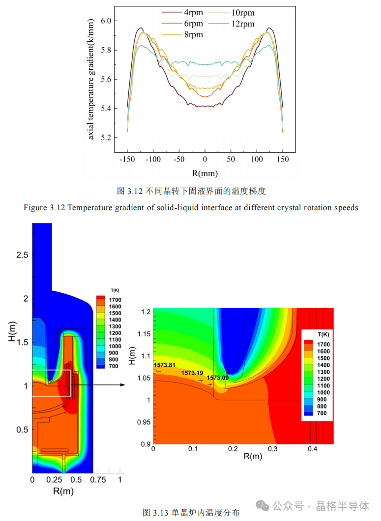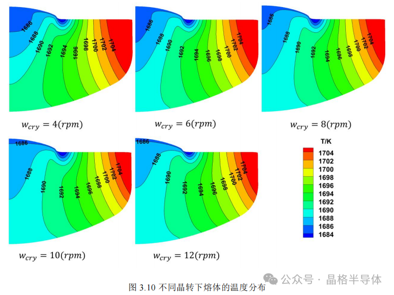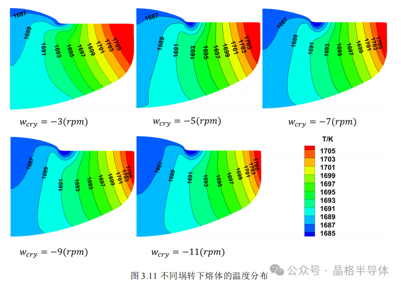 熔体中的温度分布一般是固液界面处最低,沿坩埚壁方向温度升高,这是由坩埚壁靠近加热器,固液界面远离加热器,靠经水冷屏等的热场结构决定的。如图3.10,随着晶转增加,熔体中接近坩埚壁处的温度而降低,固液界面中心下方附近的熔体温度升高。通过加大晶体的转动加速了熔体中的热量传输,使固液界面的温度分布更均匀,而且坩埚壁上的高温区分布少了,有助于减少坩埚中氧的析出,减少晶体中的氧含量。根据图3.11,随着坩埚转速的增加,靠近坩埚壁处的温度有所降低,固液界面中心下方熔体的温度也降低了。坩埚壁附近出的温度降低,坩埚中的氧析出就少了,但是固液界面中心下方的熔体温度比边缘处的低太多,熔体温度分布不均匀,不利于晶体的生长。