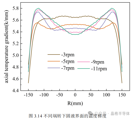 根据图3.14,可以发现随着埚转的增加,固液界面中心的温度梯度降低,且温度梯度均匀性变差。因为随着埚转的增加,环流开始变小,从平铺整个界面上,缩到中心处,对固液界面处熔体的搅拌作用减少,热质传输减少,温度梯度沿固液界面变化变大。从不同晶埚转对温度梯度的影响结果看来,高晶转、低埚转不但能让固液界面处的温度梯度更高,且固液界面上的温度梯度变化变小。