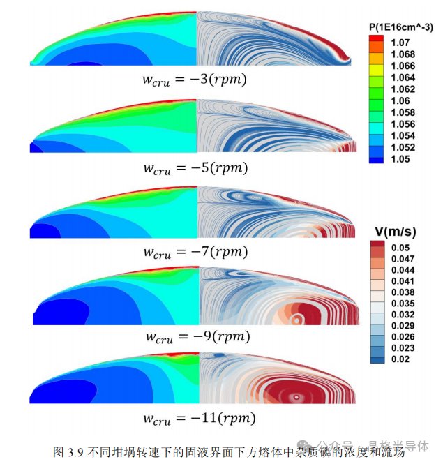 坩埚旋转可以使得熔体中的杂质分布更均匀。图3.9 为晶转12rpm,不同埚转下的磷杂质浓度和流场。从结果看来,坩埚转速较低时,在环流地作用下中心地磷浓度较为均匀,随着坩埚转速的增加,环流缩小集中使得磷富集中固液界面中心。在埚转为-3、-5rpm 时,环流铺满了整个固液界面,且在边缘处的速度更大,使得边缘处有效分凝系数更高。虽然在-3rpm 时,熔体的磷杂质分布更均匀,但是-5rpm 时,磷杂质在晶体中分布更均匀。就是因为环流使得-5rpm 比-3rpm 在边缘处的有效分凝系数更高。分凝系数越高,根据公式(2.10),晶体中的浓度(𝐶𝑆)越高。虽然-3rpm 时熔体中磷杂质的浓度更均匀,但由于循环作用,晶体边缘的磷杂质浓度比-5rpm 时更高。这也是环流的作用比磷杂质浓度影响更大的表现。埚转-7、-9、-11rpm 时,坩埚转速的增加使得磷杂质向固液界面中心处聚集且环流从向中心变小。这导致了晶体中磷杂质分布随着坩埚转速的增加变得越来越不均匀。