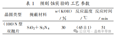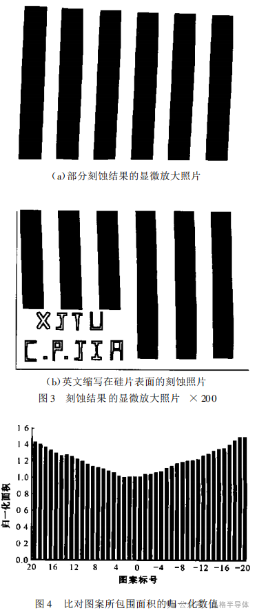 在晶圆的蚀刻工艺中, 掩蔽图案和晶向的对准至关重要, 但是到底掩蔽图案和晶向的对准程度如何,这一结论只能通过最终的加工结果来判定。因此,如果能够采用一道预刻蚀工艺 ,将硅片的晶向清晰地暴露出来, 那么在后续的曝光工艺中就可以利用这一现场加工出来的对版标记来调整掩膜版的方位,从而确保掩蔽图案和硅片晶向之间的严格对准。根据这一原理, 设计了一组用于预刻蚀加工的比对图案 ,其主要技术参数和在硅片上的布置方式如图2 所示。用于预刻蚀工艺的比对图案由一组呈扇形分布的矩形条所组成, 这些矩形条的中心都位于一个大圆的圆心上, 而其长边则与这个大圆的半径方向相平行,相邻的 2 个矩形条之间的夹角为 0.1°,所有这些矩形条分布在一个夹角为 4°且以晶圆的大晶向为角平分线的扇形区域之内 ,以硅片的大晶向为对称轴,这些矩形条呈对称分布。假定硅片的大晶向方向所标记的恰好为单晶硅材料的主晶向,而在曝光工艺中,掩膜版的方向也能够做到与大晶向的方向精确对准。由于位于比对图案中间的那个矩形条的长边方向恰好位于主晶向之上,在蚀刻加工过程中,这个图案将严格保持为矩形 ,而其他的比对图案则由于其边长方向偏离了主晶向,因而由它们所形成的蚀刻坑将发生不同程度的底切现象,从而导致图案的形状发生畸变.随着矩形条的长边方向偏离主晶向的增加,也加深了图案的畸变程度。由于晶圆在制造过程中的切片误差, 以及其他因素的影响,硅片上所刻制的晶向缺口与单晶硅材料的主晶向之间有 ±1°~ ±2°的偏差,因此在实际进行蚀刻加工时,位于比对图案中间的那个矩形条未必能够恰好处于主晶向之上。但是,由于预刻蚀图案中的所有矩形条以 0.1°的间隔偏离了由大晶向两侧面±2°范围内的所有角度,因此在这一组比对图案中,必有一个(严格地讲 ,最多可能有 2 个)矩形条的方位与单晶硅材料的主晶向最为接近,从而在预刻蚀过程中,由这个矩形条所形成的刻蚀坑的开头最接近矩形。通过寻找由预刻蚀工艺后所形成的刻蚀坑中最接近于矩形的那个比对图案,就可以准确地找出单晶硅材料的主晶向。实验中所采用的工艺参数如表 1 所示, 为了观察硅片表面上的比对图案在蚀刻过程中的变化情况,采用分段刻蚀的办法来对硅片进行加工。在进行实验之前, 应保证掩蔽材料具有足够的厚度以抵御刻蚀 ,同时为了避免遗漏细小图案的演变化情况, 首次刻蚀的时间不得超过 10 min。刻蚀工艺所采用的腐蚀剂为 30 %的 KOH 水溶液,采用恒温装置将反应温度控制在(65 ±1)℃内 。为了保证晶圆上的各点都能够处于均匀一致, 在反应槽中配备了磁力搅拌器。为保护晶圆表面, 将加工、清洗完毕的硅片在惰性气体环境中进行烘干。图 3 是本次实验所得到的刻蚀结果的显微放大照片中的一部分 .从这些照片中可以看出,虽然各矩形图案的畸变程度随着图案与主晶向夹角的增大而显著增加, 但是要想凭肉眼观测出底切现象最轻的那个矩形条,却并不是一件容易的事情 .为了找出与主晶向最为接近的那个矩形条所在的位置, 采用数字图像处理技术对显微图片进行了处理, 其过程如下:首先对图像进行二值化操作,以去除照片中无用的色彩信息分量 ;然后利用二维数字滤波器对图像进行低通滤波, 以消除图像中的毛刺和污点等高频噪声;最后采用轮廓跟踪和边缘提取技术来分离出各矩形图案的边缘线条(实际上由于底切现象 ,这些矩形条多少都有一些变形 ,因此从严格意义上来讲 ,应该称它们为多边形),并计算由这些封闭线条所包围的面积.由于底切现象可以引起腐蚀坑大小的变化,因此通过寻找具有最小面积的那个矩形图案, 就可以找出主晶向所在的方位。图 4 给出了 41 个矩形轮廓所包围面积的归一化数值(面积最小的那个矩形条的数值为 1).从图中可以看出, 位于对称轴左侧第 3 个矩形轮廓所包围的面积为最小 , 因此这个矩形条所指的方向就可以作为主晶向的一个较好的代表 ,同时还可以知道,这块晶圆的大晶向所标记的晶向误差大约为 0.3°。需要注意的是由于显微镜视场的限制 ,在左侧第 15个矩形图案上有一部分未被拍摄到, 这也是造成该图案面积偏小的主要原因。为了验证本文所提出的晶圆晶向标定方法的正确性 ,采用带预刻蚀晶向标定技术的湿法刻蚀工艺对微型器件进行了加工实验。图 5 是加工结果的显微放大照片 ,从图中可以看出 ,待加工的U形槽的边缘线条笔直, 棱角分明, 观察不出有任何畸变现象.由此可知,采用预刻蚀晶向标定技术来调整曝光过程中掩膜版的方位 ,可以明显地消除底切现象, 以及由此而产生的加工误差。