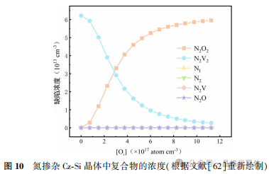 - N原子还与 Oi 形成复合物,由于 O 与 N 以及 V 与 N 之间的复合存在竞争关系,V 占据的 N 原子比例受到[Oi ]的影响,如果 N-O 络合物数量增加,那么能够形成 N-V 络合物的有效 N浓度降低,导致对原生缺陷的抑制作用降低。