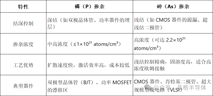 磷(P):在硅中的扩散系数较大(如 1100℃时约 1e-13 cm²/s),高温下扩散速度快,适合形成深结(如双极晶体管的发射极)。 砷(As):扩散系数较小(1100℃时约 1e-14 cm²/s),扩散速度慢,适合形成浅结(如 MOSFET 的源漏区、超浅结器件)。