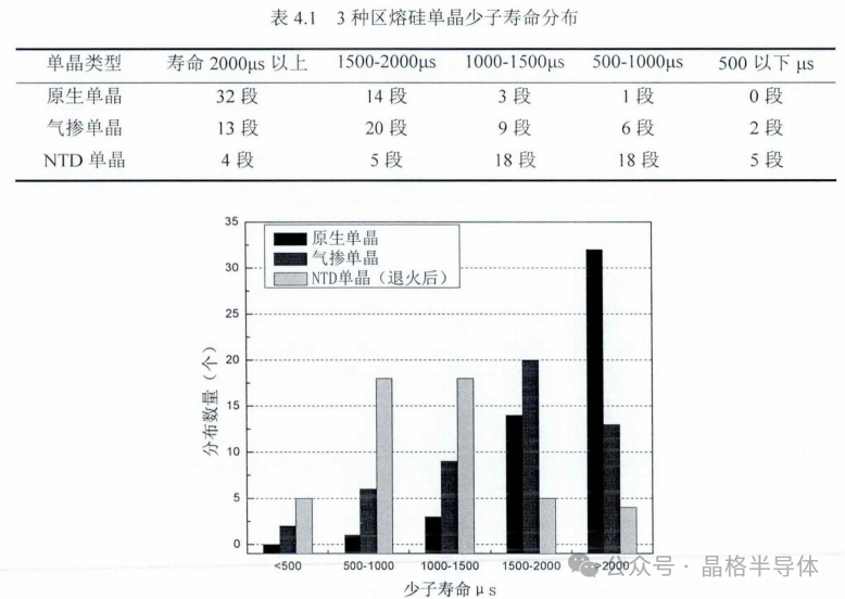 相比较原生区熔硅单晶,气相掺杂区熔硅单晶的少子寿命整体分布略低。主要分布在1500~2000μs 之间,1000~1500us 以及 2000us 以上的单晶硅也比较多。低于 1000μs的很少,并且同原生单晶相同,这区间的单晶硅属于不合格产品。由于采用中子辐照(NTD)掺杂,NTD单晶必须在掺杂后进行热处理。所以这里选用的是退火后(850℃,2h)的NTD单晶。可以看出,其少子寿命主要分布在1000us左右,大于2000μs 以及小于 500us 的很少。而且小于500us 的单晶属于不合格产品。