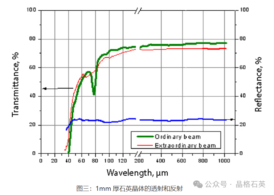我们提供了两个图片,分别表示熔融石英的透射率和天然石英的透射率,两个透射光谱曲线都已包含计算菲涅耳反射损耗(1-R)2,而透射图中最上面的曲线表示菲涅耳反射损失。不管对于熔石英还是天然石英,250nm~2800nm波段范围内的造成透射损失的原因是反射,几乎没有吸收。上图是几款商用熔融石英的透射光谱,可以看出它们在185-2600nm都有很高的透射率,根据型号的不同,透射光谱略有差别,比如有的型号在165nm的深紫外波段还具有80%以上的透射率,有的型号在2800nm附近有一个吸收峰,有的型号直到3500nm还能一直保持大于80%的透射率。下图是天然石英的透射光谱,天然石英只能保证在270nm~2600nm具有很高的透射率,在紫外波段的透射率远低于熔融石英。天然石英和熔石英的反射率基本上一致,都小于<10%。其中在靠近紫外的波段接近10%,随时波长增加,石英反射率缓慢减少,在近红外的波段大概为6%。石英透射光谱的数据均来源于贺利氏公司。石英晶体在太赫兹波段的透射率(Z cut Crystal Quartz)石英晶体还能用于波长超过50μm的太赫兹波段。在从120μm起到1000μm波段,石英晶体的透过率为>70%。此外,经过z切割石英晶体材质的太赫兹窗镜,在可见光范围和太赫兹波段都具有高透过率,能够通过HeNe激光器的辅助,轻松调整光学系统,而且不会改变光偏振状态。