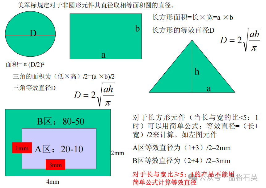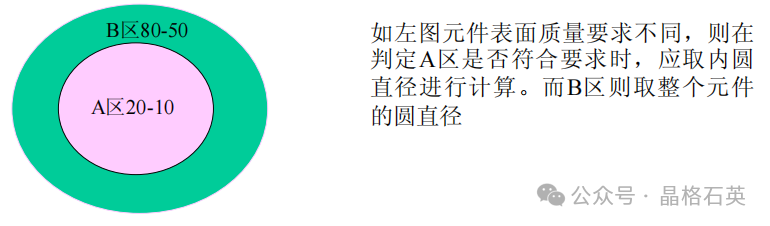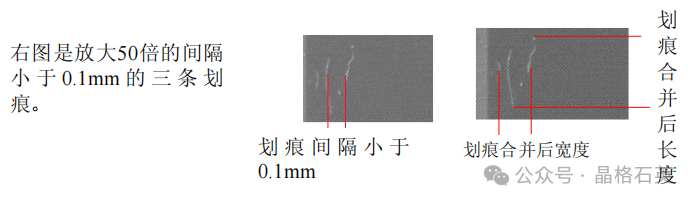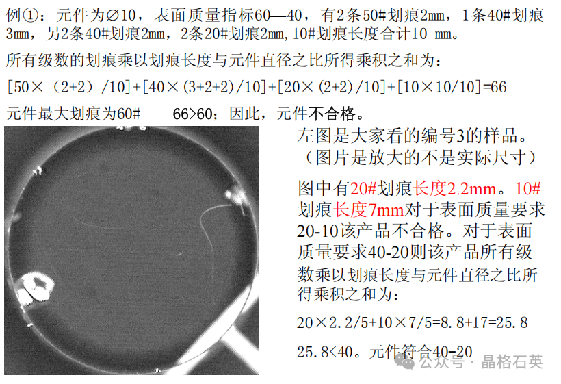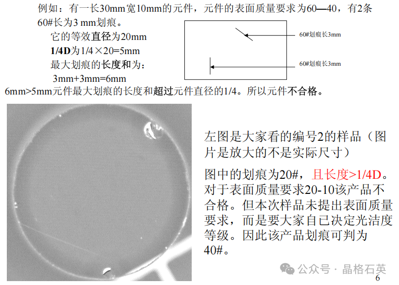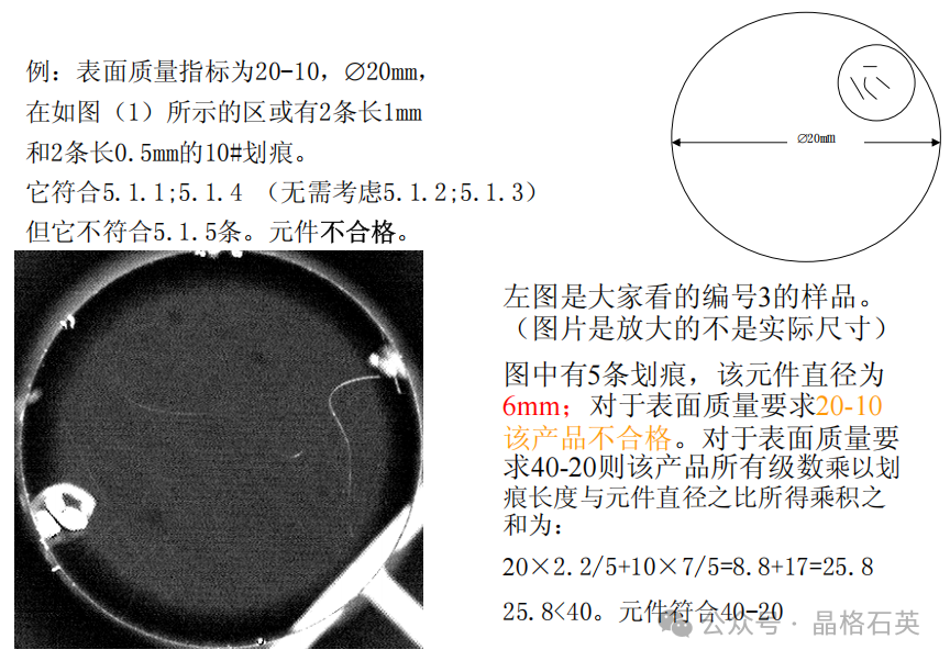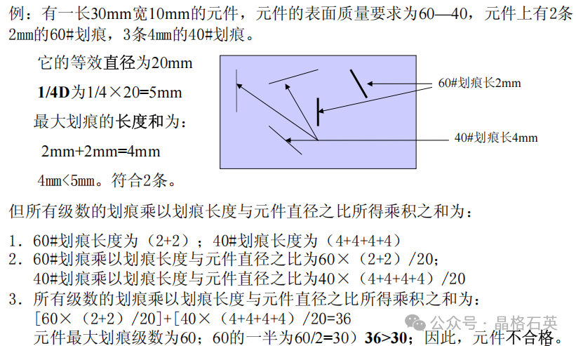 表面缺陷标准:依据美国军用标准MIL-PRF-13830B用两组数字表示表面缺陷大小。例如40/20前者限制划痕大小,后者限制麻点大小。道子、亮路都统称为划痕。斑点、坑点、点子 都称为麻点。规定长与宽的比大于4:1的为划痕;长与宽的比小于4:1的为麻点。当元件的不同区域表面光洁度要求不一样时,等效直径的计算以区域进行:表面质量要求高的内区域其等效直径以内区域为准(如有效孔径的区域),表面质量要求低的外区域计算的是整体元件的等效直径。以美国军用标准《MIL-O-13830》的表面质量划痕样板作为各级数划痕的比对标准。(注意:美军标未指明划痕的计量单位也即未确定划痕的宽度和深度,只能以实际观察样版为标准。)这里的划痕级数就是通常的划痕号数,标准样版有10#、20#、40#、60#、80# 5个级。SC-QA027表面质量标准共有7条划痕判定标准,前5条是美军标的规定,后两条是公司内控标准。以下逐条讲解:1、当元件的划痕级数超过表面质量要求的划痕级数时,元件不合格。例如:元件的表面质量要求为60/40,则代表元件的划痕必须≤60#,如果元件有>60#的划痕,则元件不合格。2、当元件的划痕级数未超过表面质量要求的级数,但元件存在最大划痕时,所有最大划痕的长度之和应不超过元件直径的1/4。3、当元件存在最大划痕,而最大划痕的长度之和未超过1/4D,要求所有级数的划痕乘以划痕长度与元件直径之比所得乘积之和,不得超过最大划痕级数的一半。4、当元件的划痕级数未超过表面质量要求的级数,且元件不存在最大划痕时,所有级数的划痕乘以划痕长度与元件直径之比所得乘积之和,不得超过最大划痕级数。5、当元件质量指标要求划痕等级为20或优于此等级时,元件表面不准有密集划痕即在元件中任何一个∅6.35mm面积的区域,不允许有4条或4条以上的大于等于10#划痕。6、对于圆形元件不允许有20# 级数以上与直径相等的划痕。对于方形元件不允许有20#级数以上贯穿元件的划痕。7、当两条或多条划痕之间间隔小于0.1mm时,划痕合并为1条计算,合并后的划痕长度从划痕开始到划痕结束,宽度取划痕的外边。
