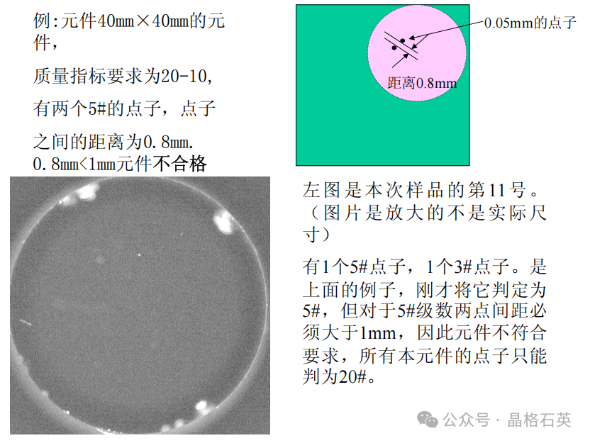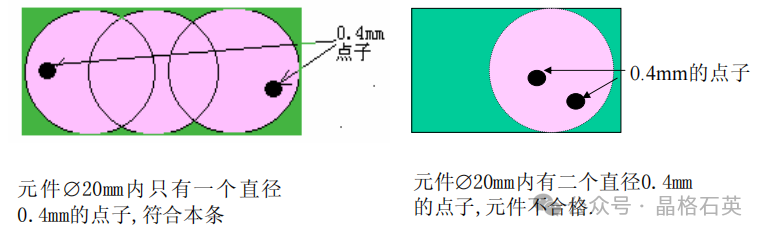 依据美国军用标准MIL-PRF-13830B麻点的级数取允许缺陷的实际直径,规定以1/100mm作为计量单位。如果麻点形状不规则。则应取最大长度和最大宽度的平均值作为直径。(注意:美军标的麻点与划痕不同,麻点是可计量的也即麻点的大小是确定的,50# 麻点也即直径D=0.5mm的麻点)1、当元件存在超过表面质量要求的麻点级数时,元件不合格。例:元件为∅20mm,质量指标要求为60/40,元件有1个直径0.5mm的麻点。50>40元件不合格。例:元件为∅20mm,质量指标要求为60/40,元件有2个直径0.4mm的麻点元件不合格。3、每20mm直径上所有麻点直径的总和不得超过最大麻点的2倍。例: 40mm×40mm的元件,质量指标要求为60-40,其中一个∅20mm的区域有40#点子一个,20#点子一个,10#点子一个,同时在另一个∅20mm区域中,20#点子2个,10#点子4个,5#点子1个。4、当麻点质量要求为10或更优等级时,任何两个麻点的间距必须大于1mm。6、当出现如图所示密集麻点时以麻点聚集的外围圈径为麻点大小。
