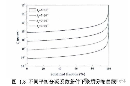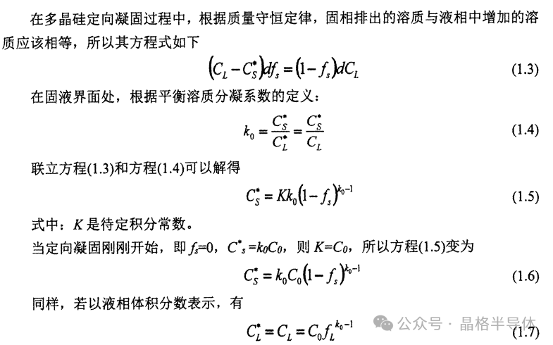 方程(1.6)和(1.7)即为著名的 Scheil方程,又称为非平衡凝固杠杆定理。根据固相和液相的体积分数,可以得到此时的固相或液相浓度及凝固过程中固相成分的变化规律,即多晶硅内偏析规律。