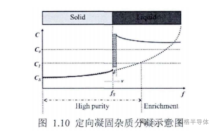 多晶硅定向凝固过程中,杂质在固相液相以及固液界面处的分布如图 1.10所示。当结晶前沿的液相中存在较为强烈的对流时,会加速液相中的溶质传输,促使界面前沿的溶质富集区的厚度减少,液相内部的溶质浓度随着结晶过程的进行而迅速增加,出现图中的溶质再分配的特性。开始凝固的多品硅杂质含量低于目标杂质含量 形成提纯区凝固末端即铸锭上部形成富集区域。