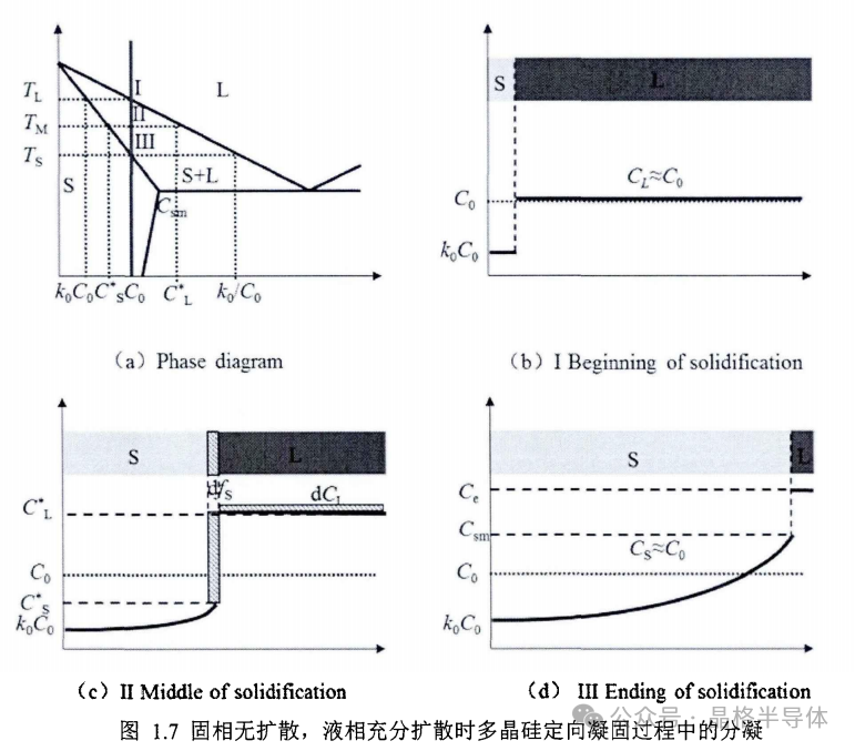 多晶硅固液界面的温度为其熔点温度,杂质在液相中的扩散系数一般在 10^-9 m^2/s数量级,而在固相中的扩散系数一般在10^-12 m^2/s数量级。可以假设固相完全无扩散而液相充分扩散(完全混合均匀)。