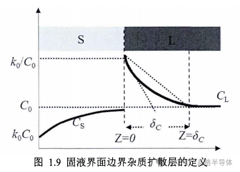 多晶硅凝固过程中,在硅熔体中只存在杂质扩散时,扩散层的厚度是最大的,凝固出的固相杂质成分和多晶硅原始杂质成分相同,达到稳态凝固。固液界面附近凝固的固相排出的溶质含量,与溶质边界层内扩散到远处液相的溶质含量相等,所以凝固界面前沿的溶质富集区保持稳定,其等效边界层(δc)长度被定义为等于 2D/v,如图1.9所示。