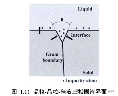 多晶硅定向凝固过程也是多个柱状晶生长过程,因此多个柱状晶构成的固液界面中存在晶粒-晶粒-溶液三相结构,如图所示,在固液界面上晶界会形成凹槽,对杂质在定向凝固的分布产生重要的影响。